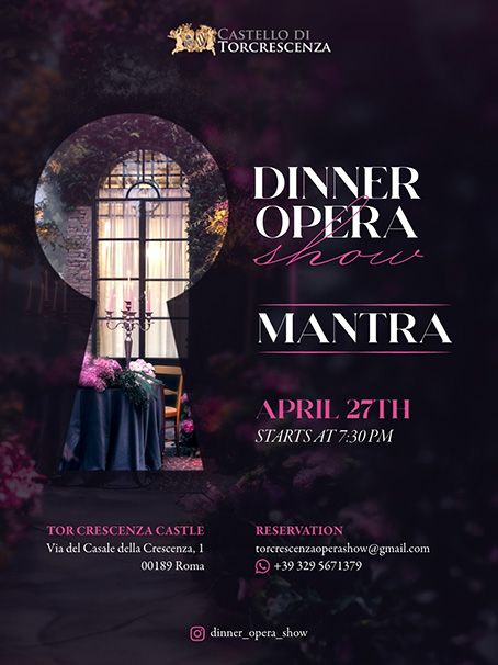 Dal 27 di aprile presso il Castello di Tor Crescenza a Roma, gioiello architettonico e dimora storica dell’XI secolo, teatro perfetto per performance senza tempo, in un’atmosfera che mescola storia e lusso moderno, cena con menù operistico (Gnocco alla Pavarotti, Pasta alla Norma, Tournedos alla Rossini e Pesca Nellie Melba come dessert), ogni portata verrà accompagnata da bellissime arie d'Opera interpretate da giovani interpreti (due soprani, un mezzosoprano, un tenore) tratte dalle opere più famose di Verdi, Bellini, Puccini, tra giochi di luci e proiezioni oniriche.